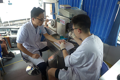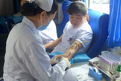 上午九点,献血活动准备工作就绪后,医院职工在献血车工作人员的指导下,认真填写献血登记表、抽血化验,经血液检验合格后开始无偿献血。这些前来献血的职工中,有工作多年的老同志,也有入职不久的新职工,有刚下夜班的工作人员,也有休假从家里赶来的,还有许多同志已经多次参加无偿献血活动。特别是在一线的医务人员,为了不影响工作也不耽误献血,同事之间轮流值班抽出时间进行献血。大家用实际行动来履行一个公民的光荣义务,表达着回馈社会、关爱社会的真挚情感和无私奉献的精神。